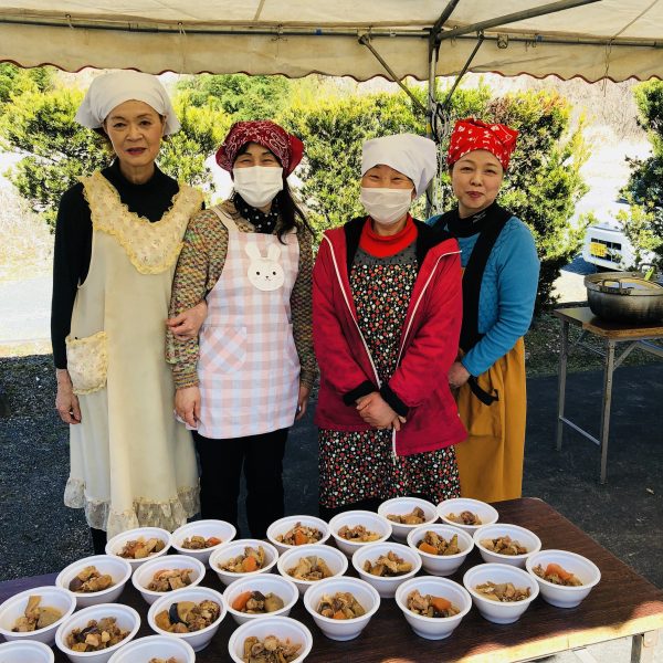 第5ポイントに到着。地域の縁起料理、中皿(ちゅざら)を作ってくださった皆さん