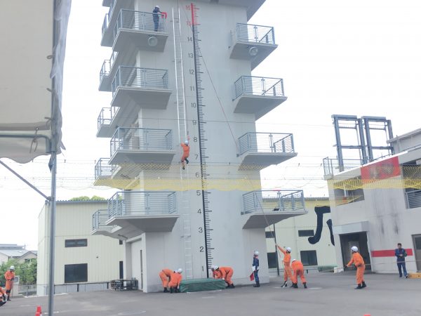 垂直はしごを15メートル登はんし、その安全確実性と所要時間を評価するもの。
