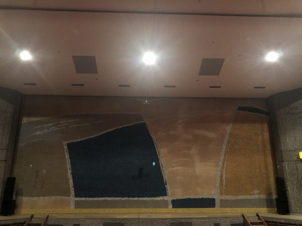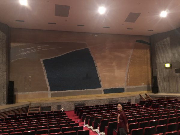最初に訪れたのは、川内文化ホール。施設長の入江浩樹さんに案内して頂きました。こちらの大ホール舞台の緞帳(どんちょう)は、山口長男がデザインを手掛けた貴重なものです。