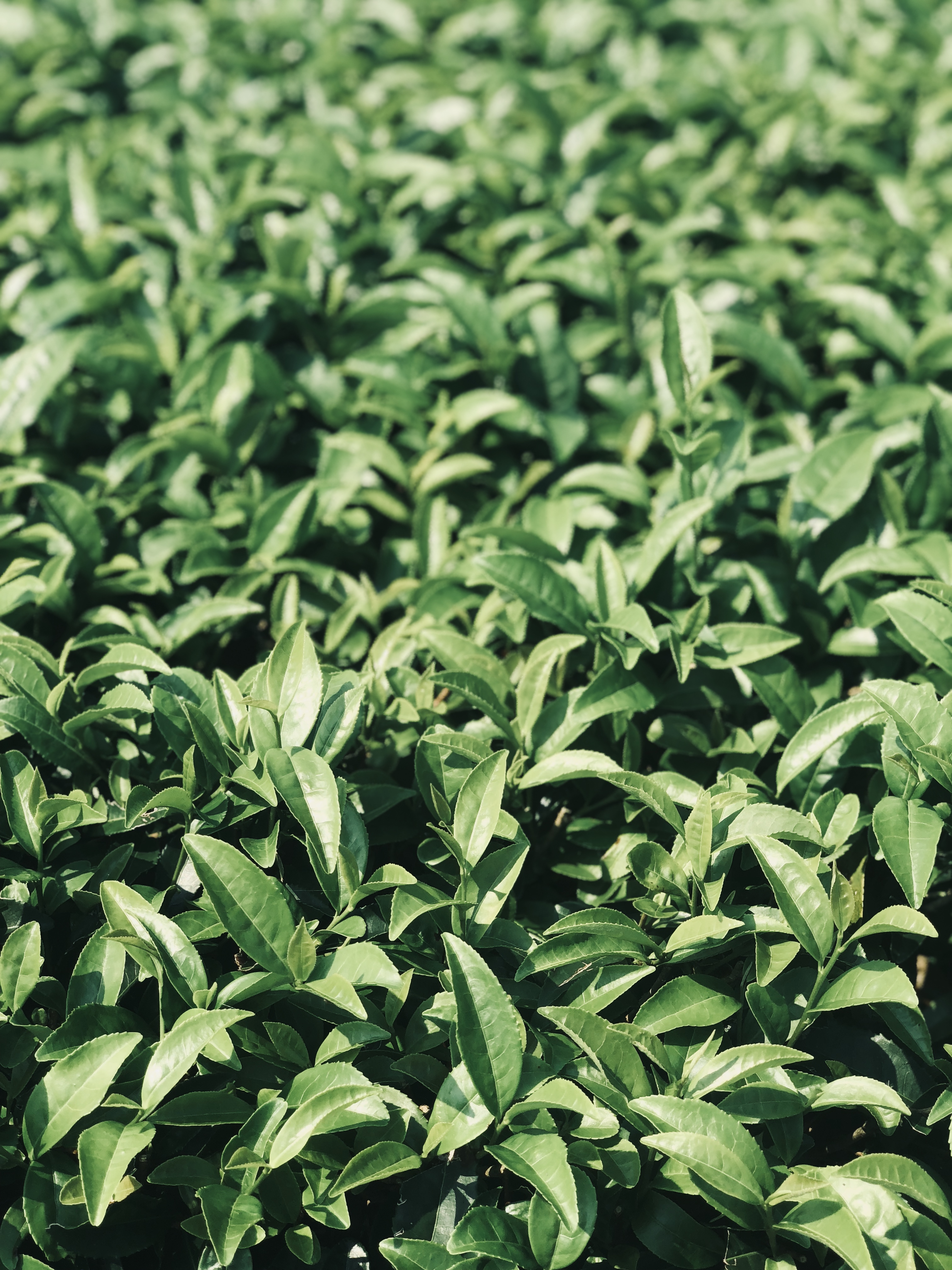 薩摩川内市久住町にひろがる笹野製茶・茶園のひとつ。美しく整えられたお茶の木が並びます。新茶の季節から秋口まで収穫は続きます。