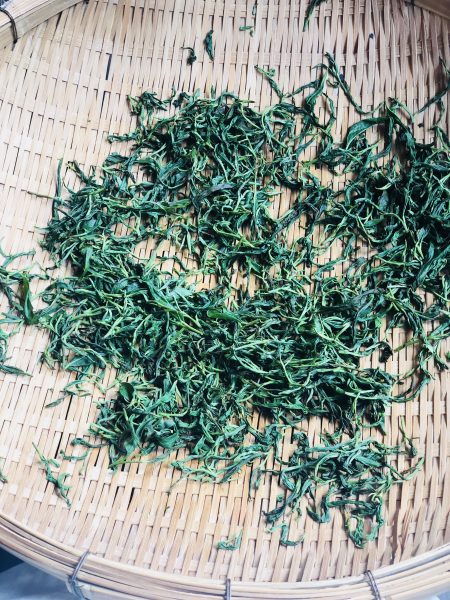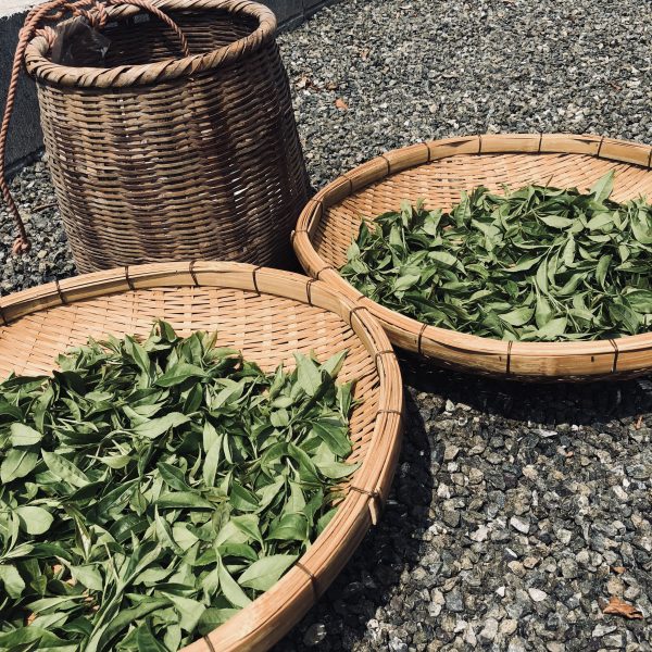 さきほど摘んだ茶葉。1時間ほど天日に干してから、手でもんでいきます。