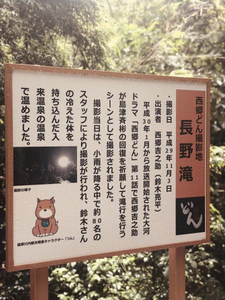大河ドラマの撮影に立ち会われた薩摩川内市商工観光部シティセールス課の井ノ下さんによると「西郷隆盛役の鈴木亮平さんが君主である島津斉彬公の回復を祈って、滝行をするシーンの撮影が行われた場所です。撮影後には名湯・入来温泉から温泉を運び、鈴木さんはじめスタッフの皆さんにかけ湯をして、冷えた体を温めていただきました!」とのこと。