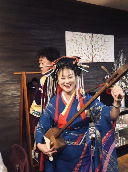 特任ガイドのお二人、夕食の席ではごったんの演奏で「焼酎の神祭り甚句」を披露。テーブルでは「なんこ」大会も。焼酎神社に参拝したおかげか、皆さん「よか晩」になったようです。