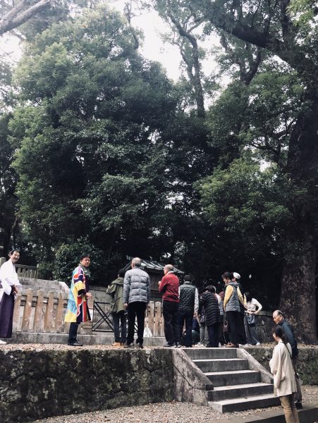 翌日、一行は陸路鹿屋へ。桜島を望みつつ高速道路を走り、到着したのは「吾平山上陵」。ニニギノミコトの子ヤマサチヒコとトヨタマヒメのあいだに生まれたウガヤフキアエズノミコトの御陵です。