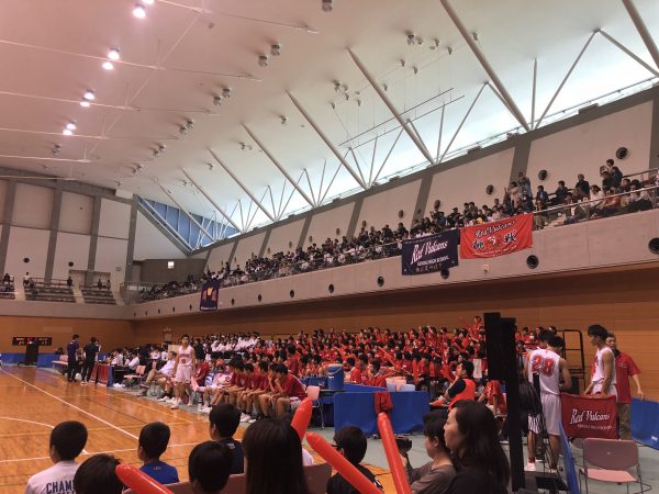 応援席がコートサイドに設置され、チーム・応援席が一団となって盛り上がります。