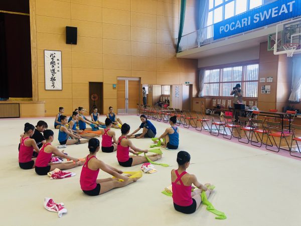 講演後、新体操部の指導がスタート。タオルを足裏でたぐり寄せるトレーニングから始まり、柔軟体操、ストレッチと丁寧に指導していきます。