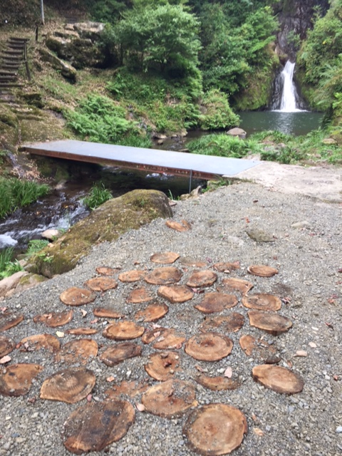 丸太切りして、オブジェ風に滝近くの休憩所付近に埋め込みました。