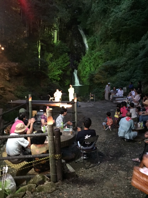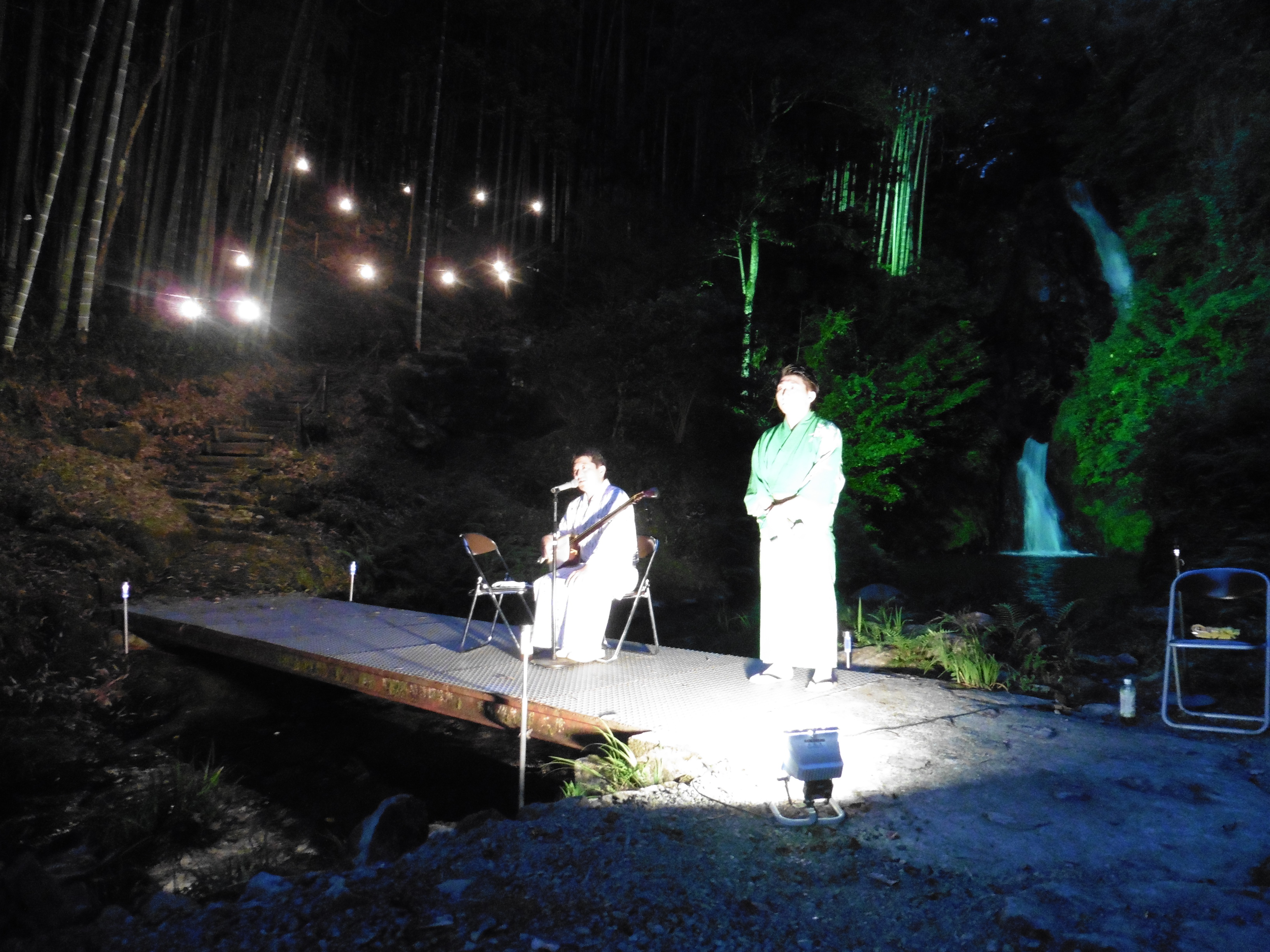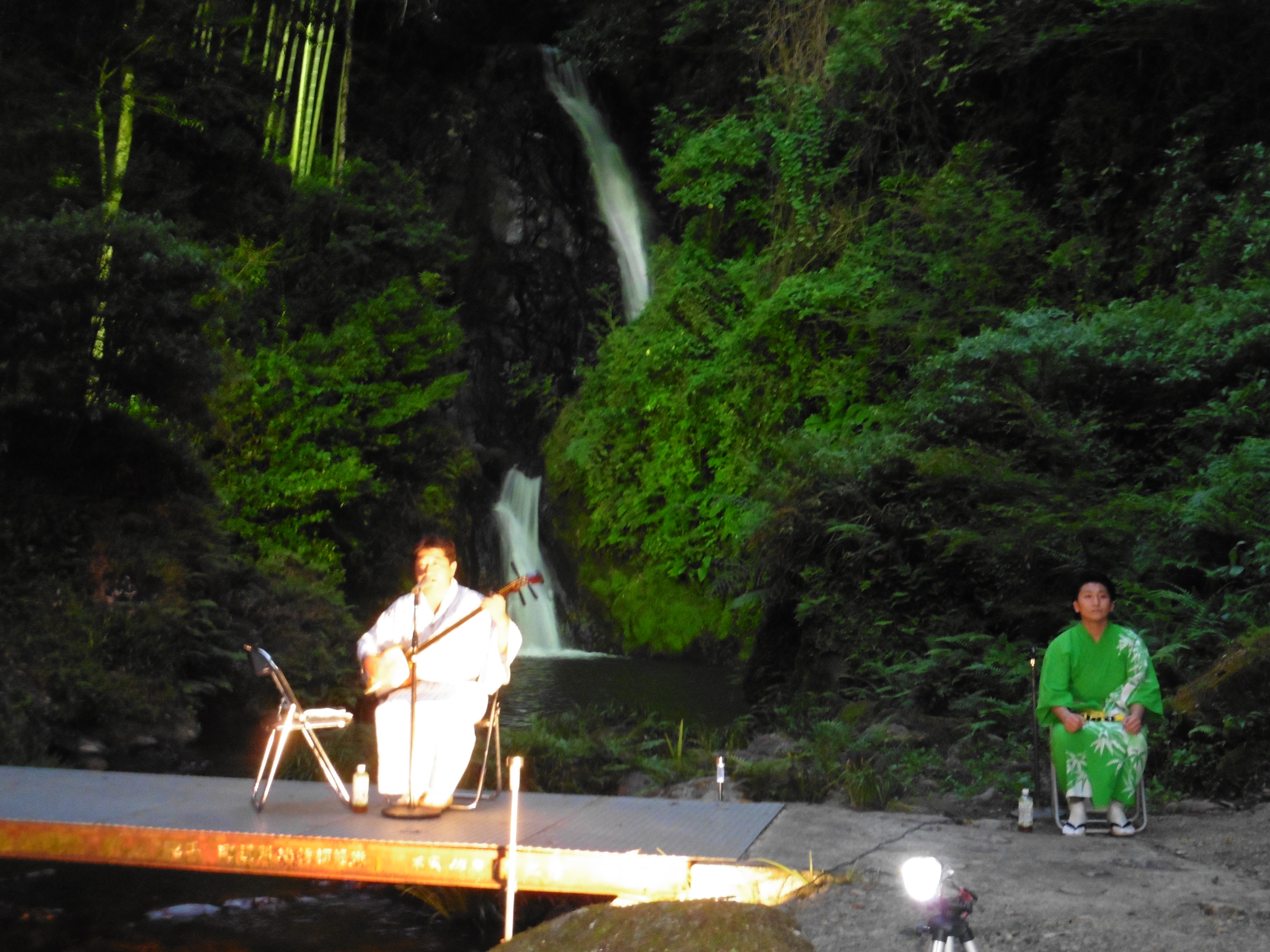滝をバックに「三味線生演奏会」