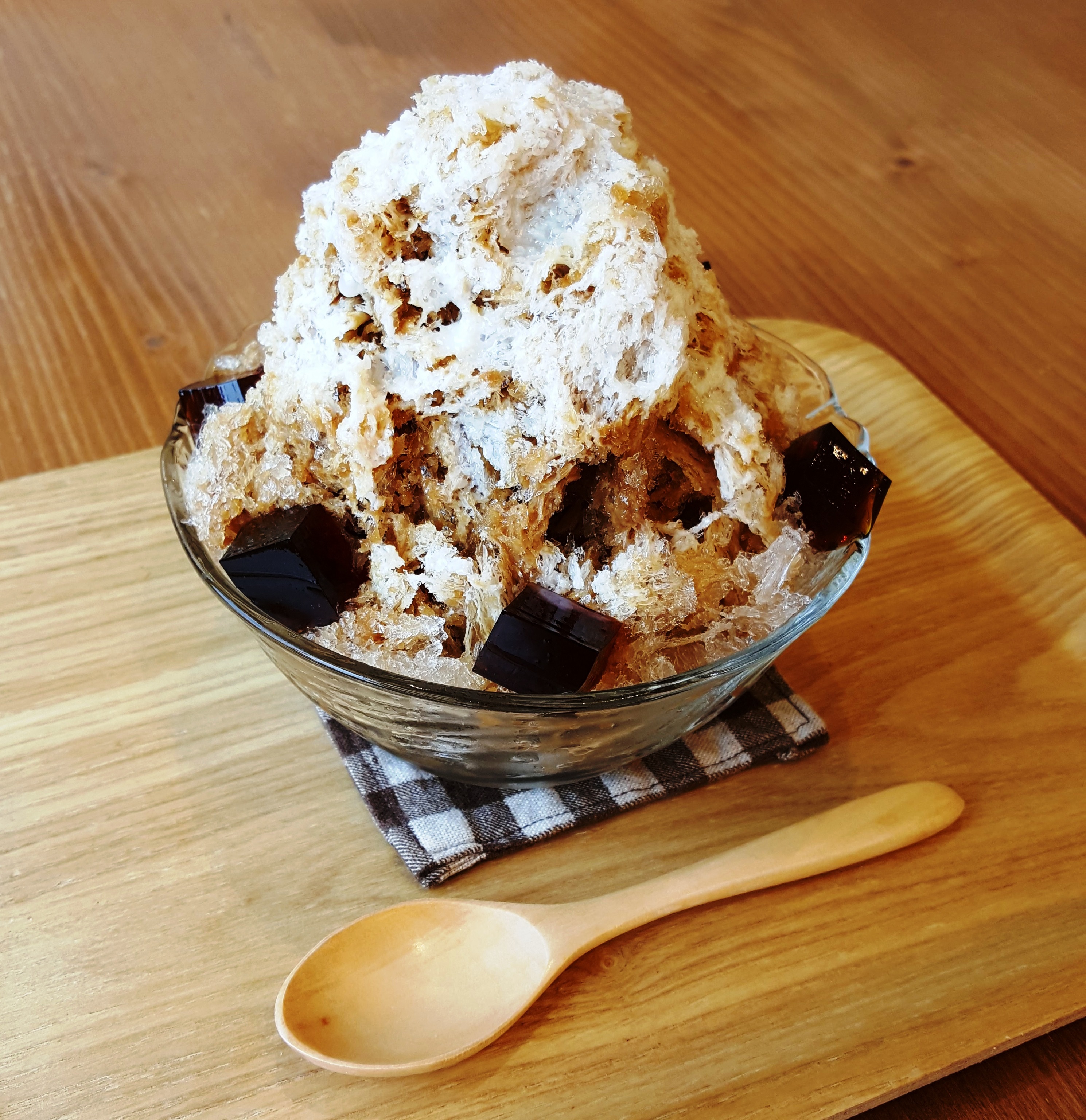 お店の方オススメの「カフェオレ」を食べてみました。コーヒーシロップと練乳のかかったかき氷に、コーヒーゼリーをトッピングしてあります!