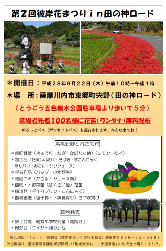 東郷町鳥丸宍野で今年も『彼岸花まつりin田の神ロード』が行われます。