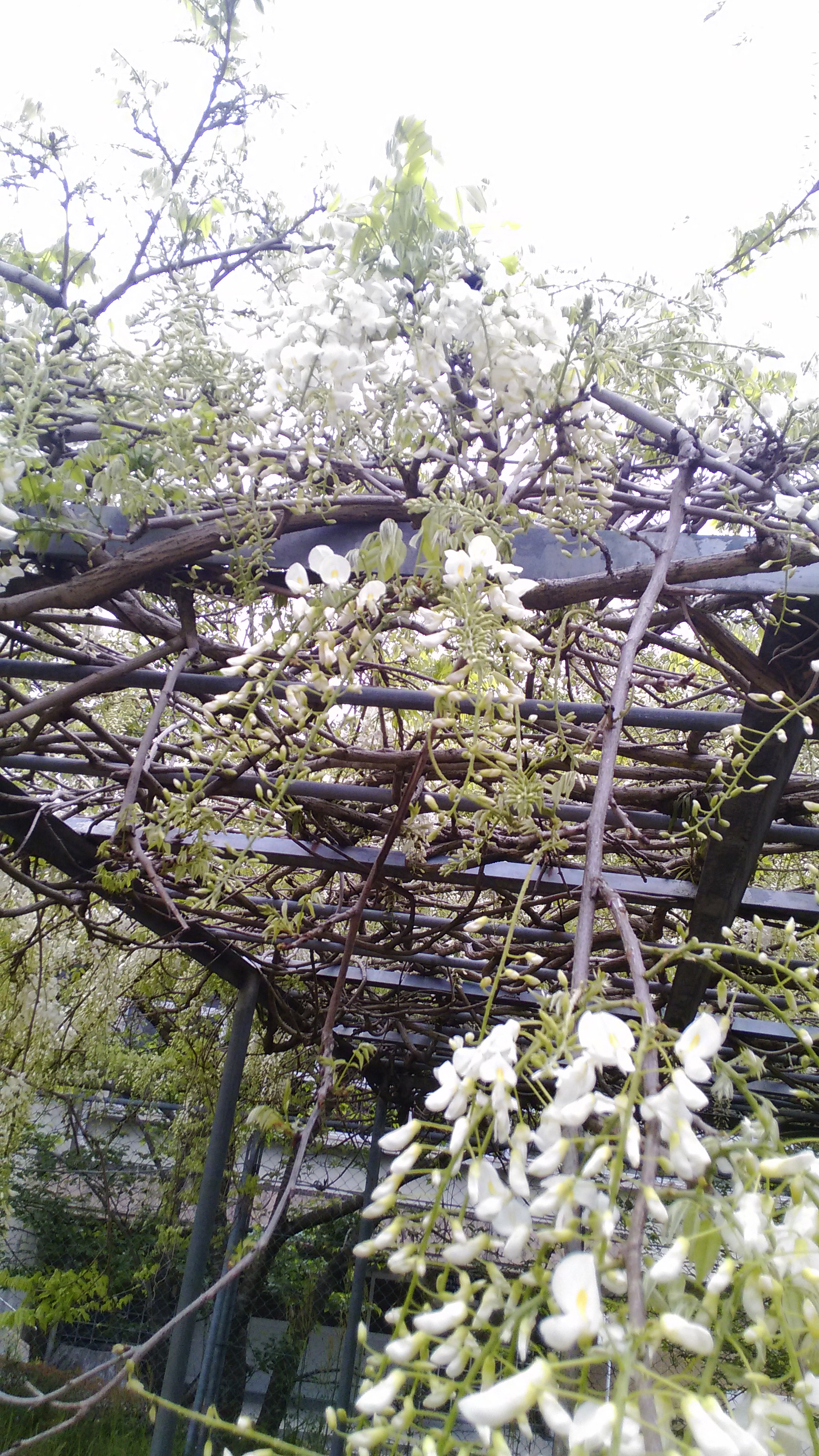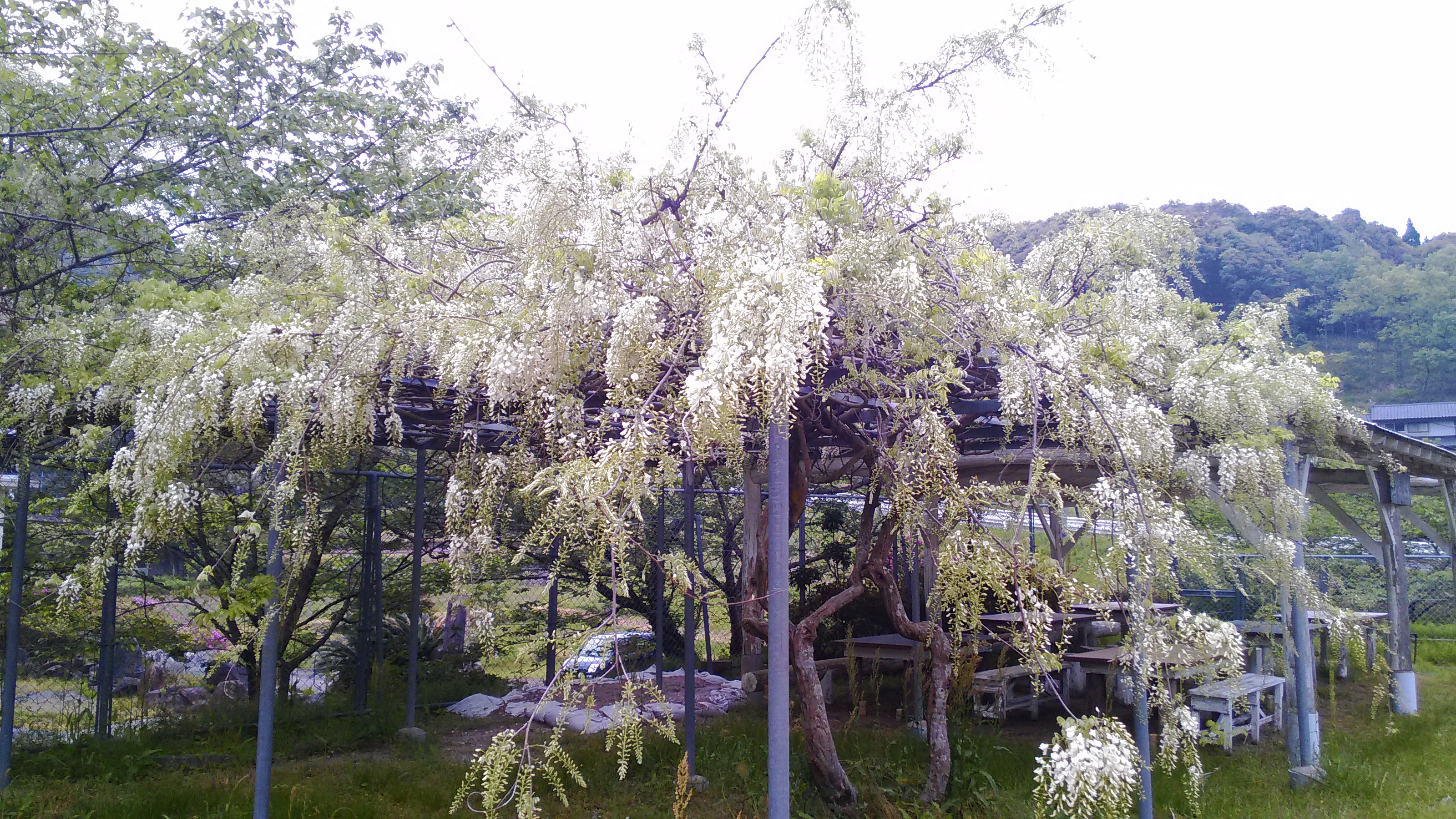 旧野下小学校の校庭には白い藤が今から見頃を迎えます。