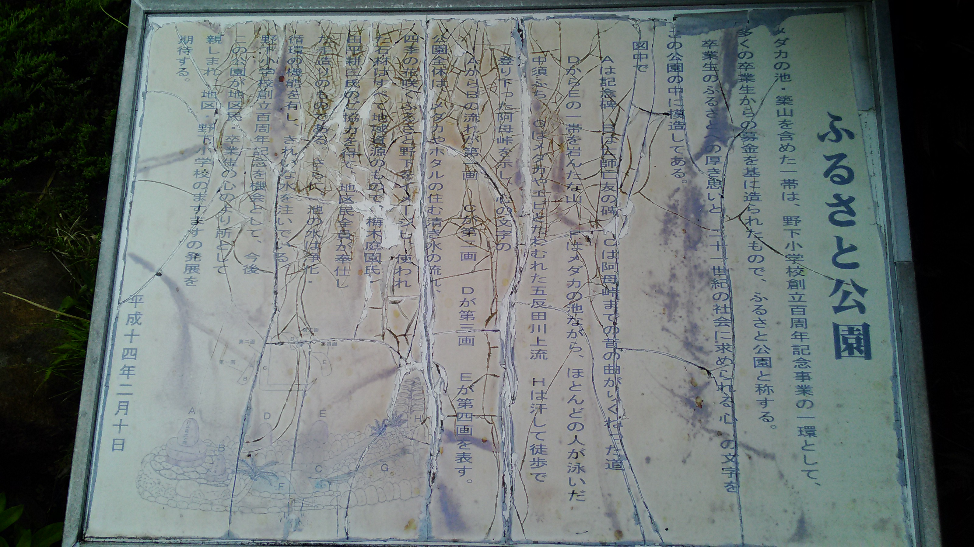 平成14年には100周年記念式典が盛大に執り行われました。藤棚以外にも記念事業として、簡易郵便局前には「野下小学校発祥の地」標が立ったり、学校入口には「ふるさと公園」が作られました。