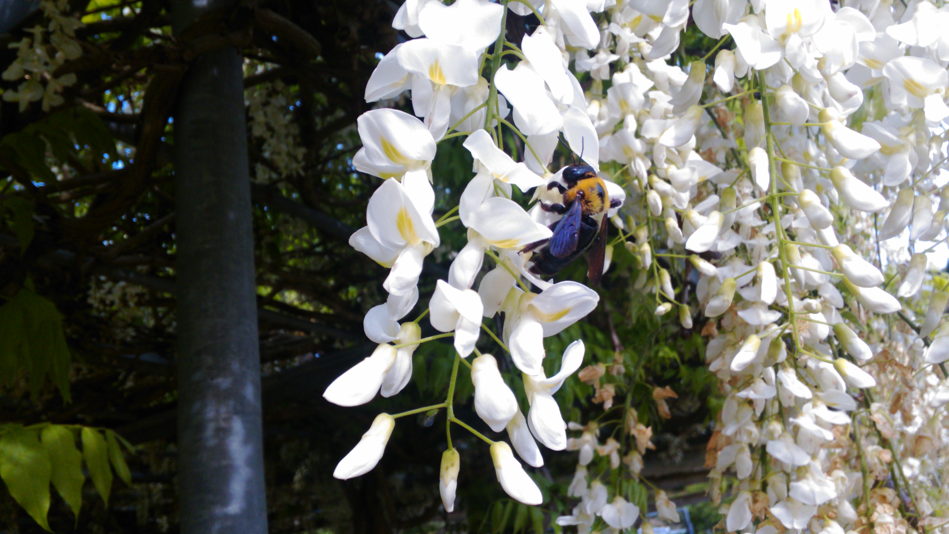 春になると・・・旧野下小学校校庭には、鯉のぼり、白い藤、四つ葉のクローバー、マルハナバチ。