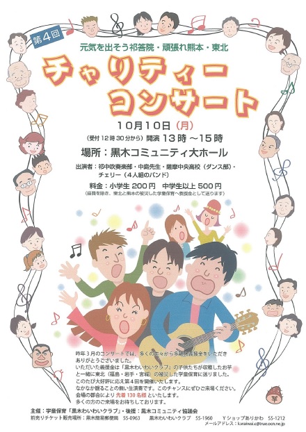 10月10日、黒木わいわいクラブ主催のチャリティーコンサートが行われました。義捐金は、東北や熊本の被災した学童保育におくります。