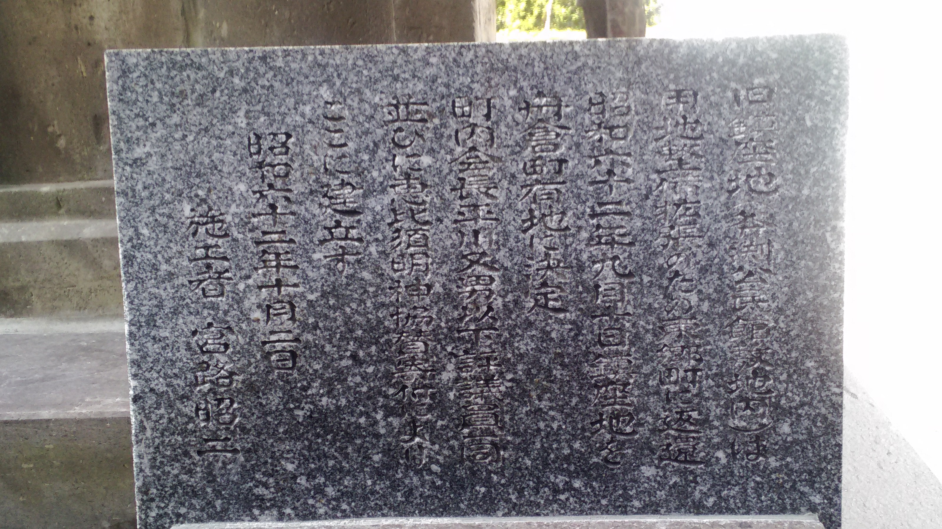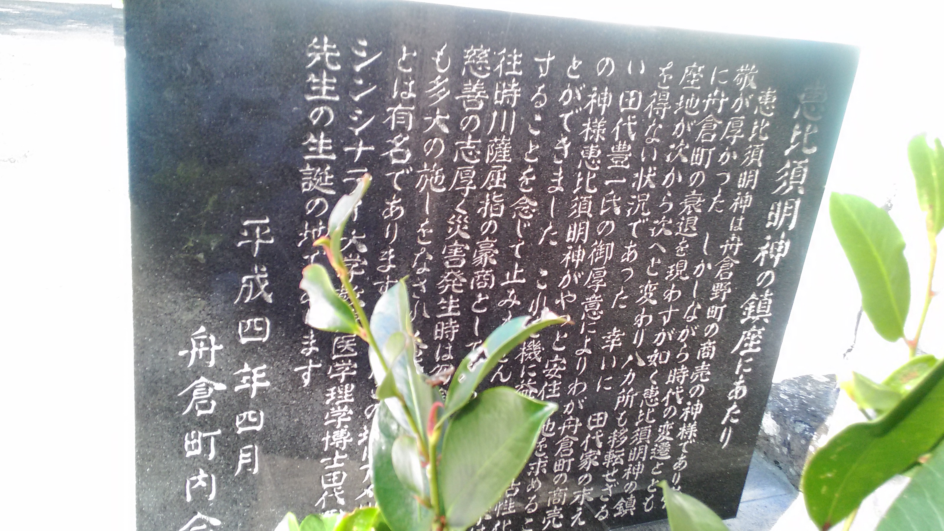 緒方薬局西隣→徳重雑貨店前(明治38年7月の洪水で流失・・・昭和39年1月再興、大正11年舟倉の火災により焼失、再建)→山口美容院敷地内→中原青果店敷地内→舟倉公民館敷地内→緒方薬局西隣→舟倉公民館敷地内・・・と、まだまだお引っ越しの歴史は続きますが、今は上記の場所に鎮座です。