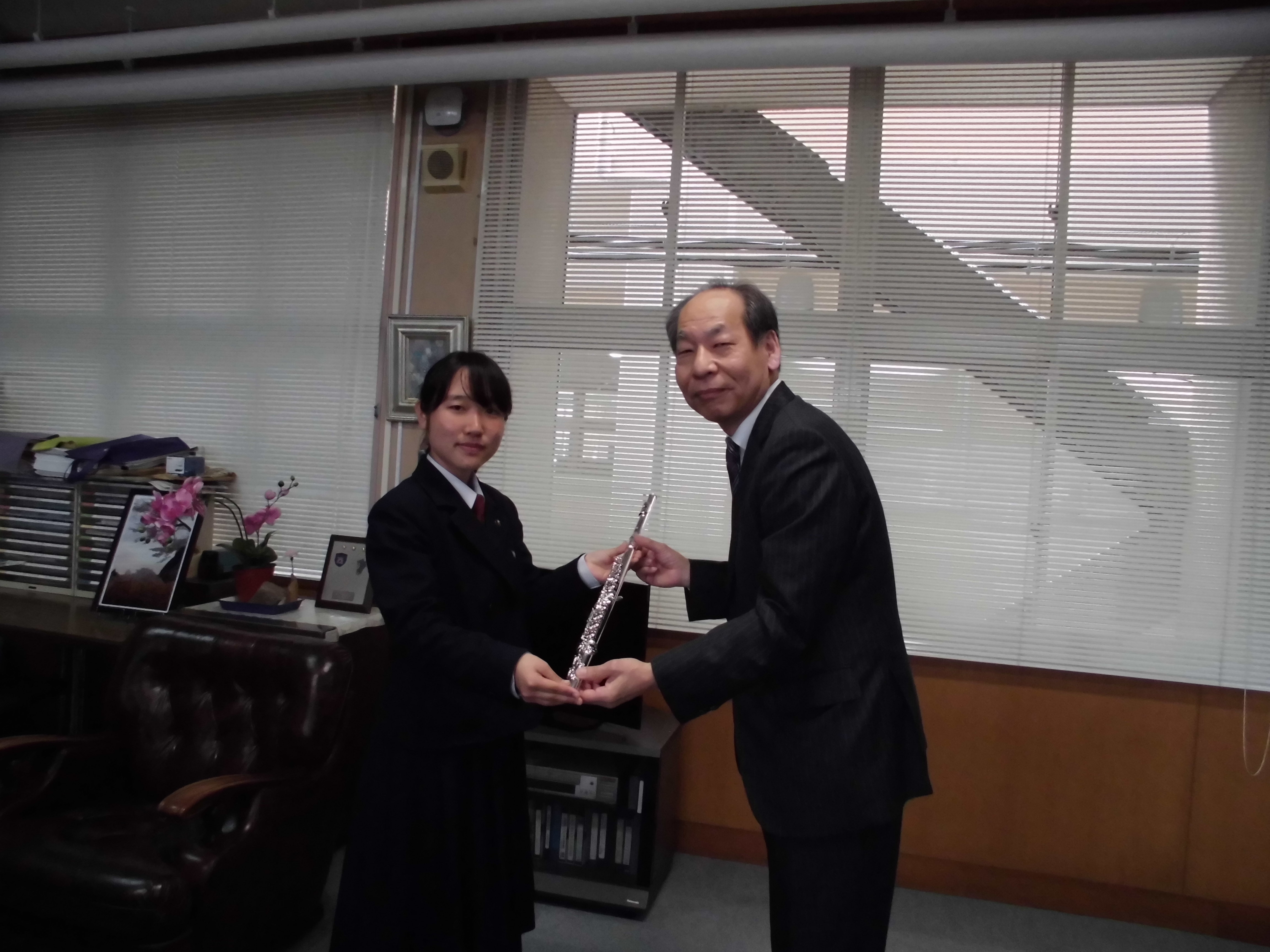 川内高校校長室にてフルートを受け取る宮脇さん。