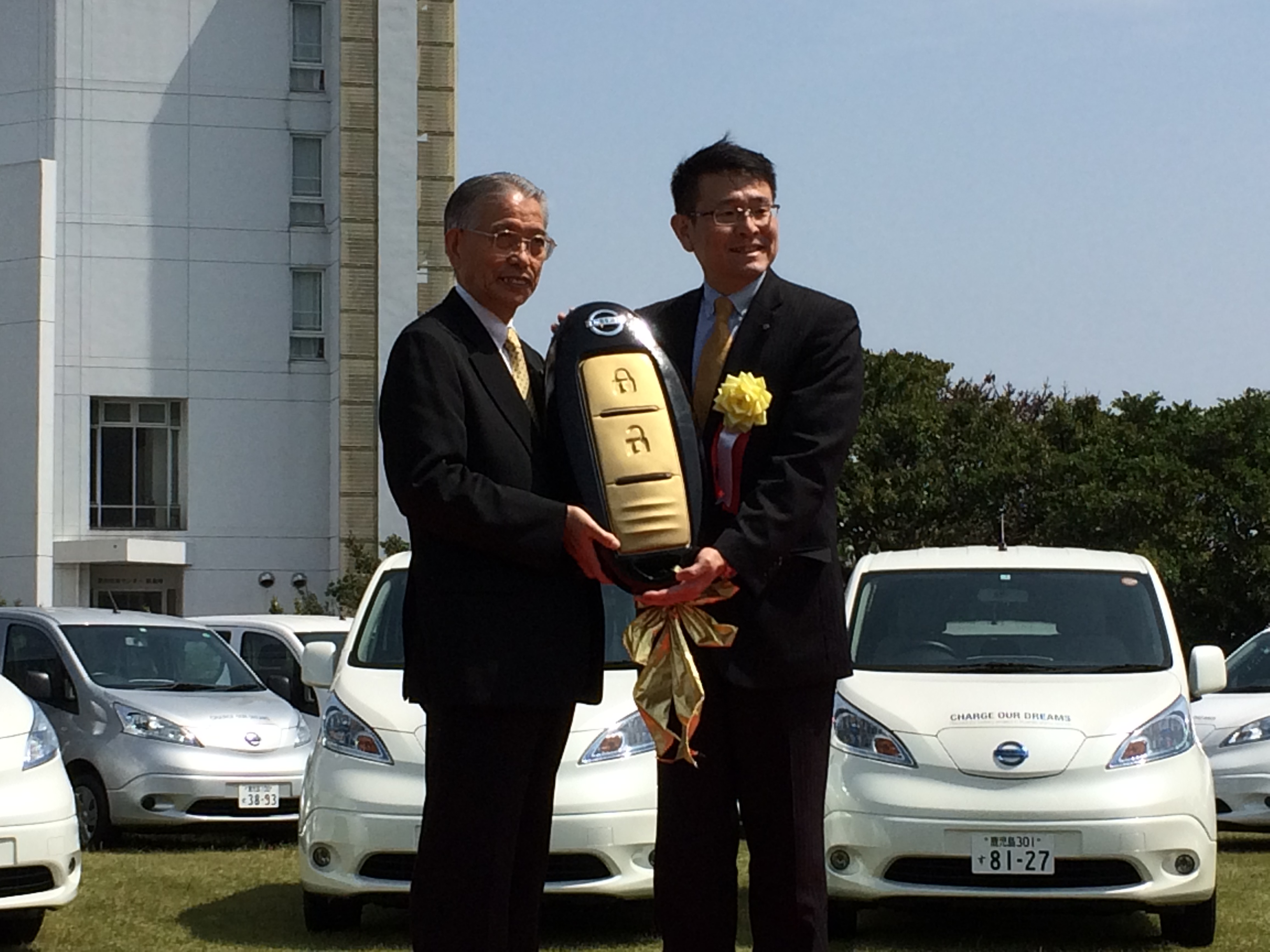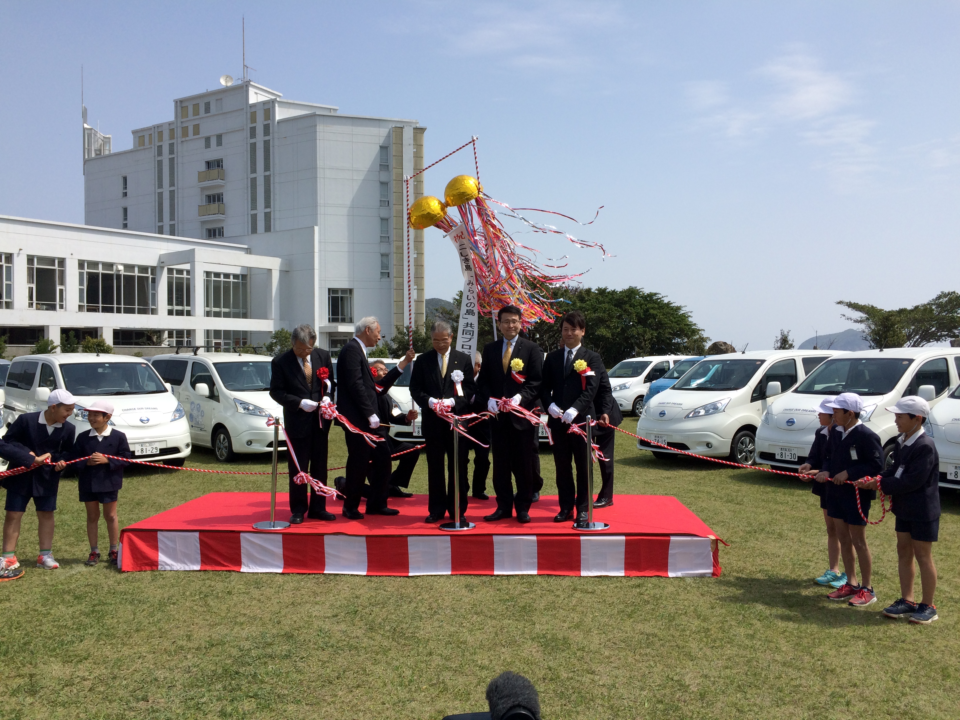 式典では九州日産株式会社の馬場勝也代表取締役社長から薩摩川内市の岩切秀雄市長へ車両キーの引き渡しや、里小学校の子供たちも参加してテープカットとくす玉開放が行われました。